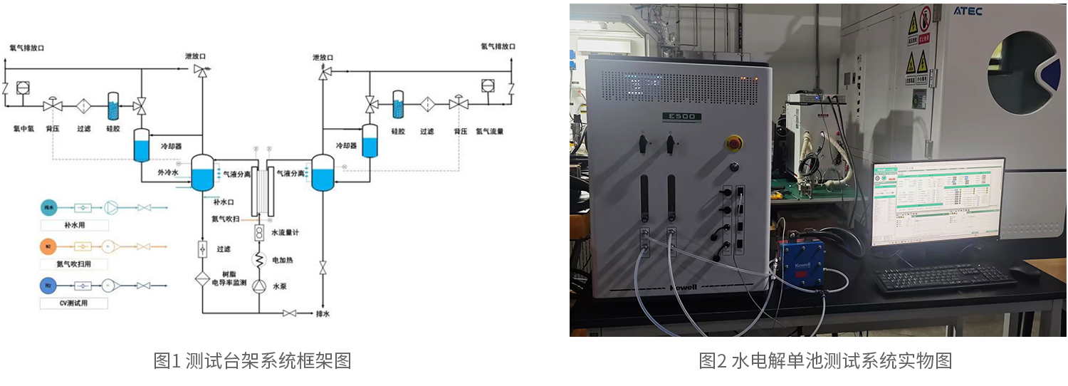 本研究使用有效面积为25cm²的质子交换膜电解池(PEMWE)进行测试。膜电极(MEA)采用Nafion 115质子交换膜制备。在完成标准电化学活化程序后,对电池性能进行表征,以下所有实验均采用科威尔E500水电解单池测试系统台架完成,测试台架系统框架图及实物图见图1及图2。E500满足基本流体调控能力外,可适配高频四象限源载,一体化实现高精度直流加载(CC、CV、CP)、交流阻抗谱(EIS)、高频内阻(HFR)、断电流内阻(IR)、快速放电(CR)及电解-燃料电池模式切换等特殊工况。