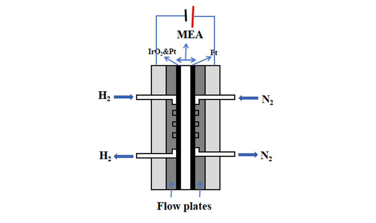 恒流法测试的原理与燃料电池中采用的恒流法类似。测试过程中,阳极侧通入氢气,阴极侧通入氮气,恒电源负极连接至阳极侧,正极连接至阴极侧。为便于比较,本研究同时采用线性伏安法(LSV)对氧中氢进行测试,具体设备连接方式见相关原理图。本实验的测试对象为完好单池,通过改变测试工况进行对比分析。