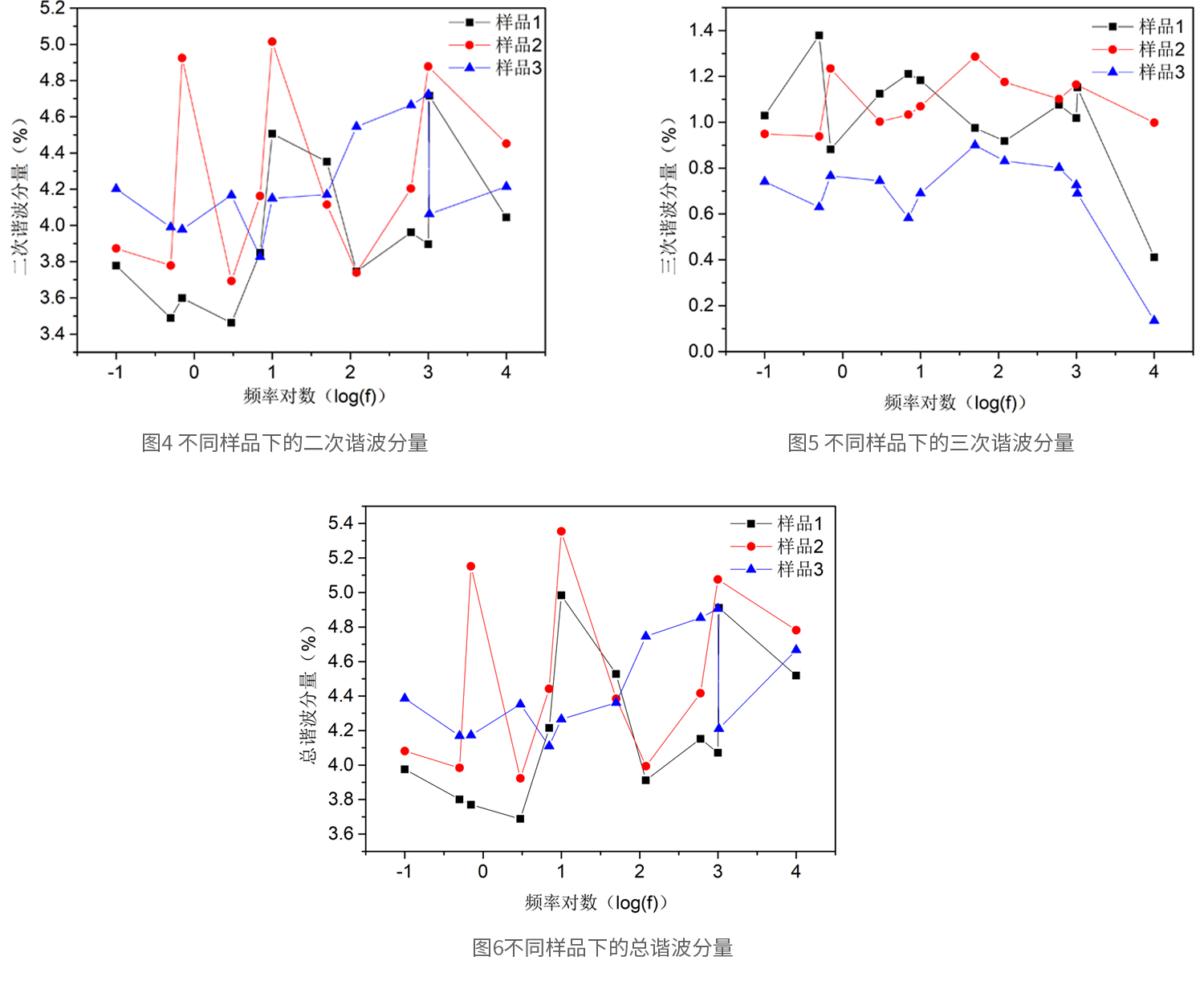 谐波失真测试的测试方案为在不同的固定频率下,对已知氧中氢含量的不同样品进行直流拉载以及交流扰动,测试工况为2A/c㎡,扰动电流在5%。由程序计算出不同固定频率、不同样品的基频频率、基频幅值、谐波失真情况。