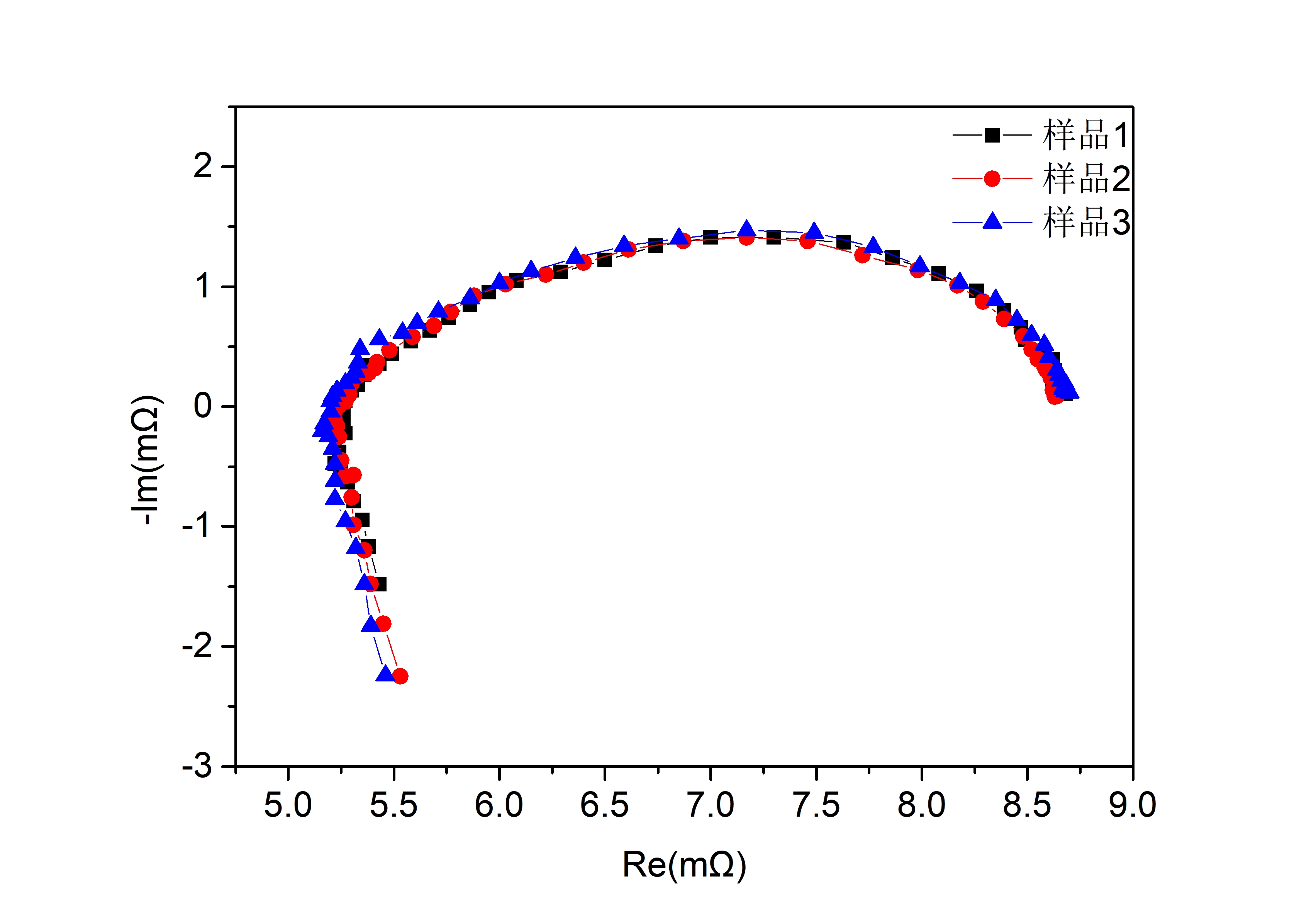 在电流密度2A/c㎡下,对不同样品分别测试EIS,扰动电流为直流电流的5%,扫描范围为0.1Hz~10kHz。
