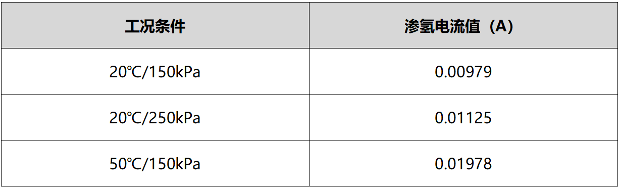结果表明,随着阴极压力的增大和温度的升高,通过LSV方法测得的渗氢电流均有所增加,该结果与水电解理论一致,表明利用LSV方法开展电解槽渗氢测试具有可行性。但相较于燃料电池测试,所得渗氢电流值明显较小。