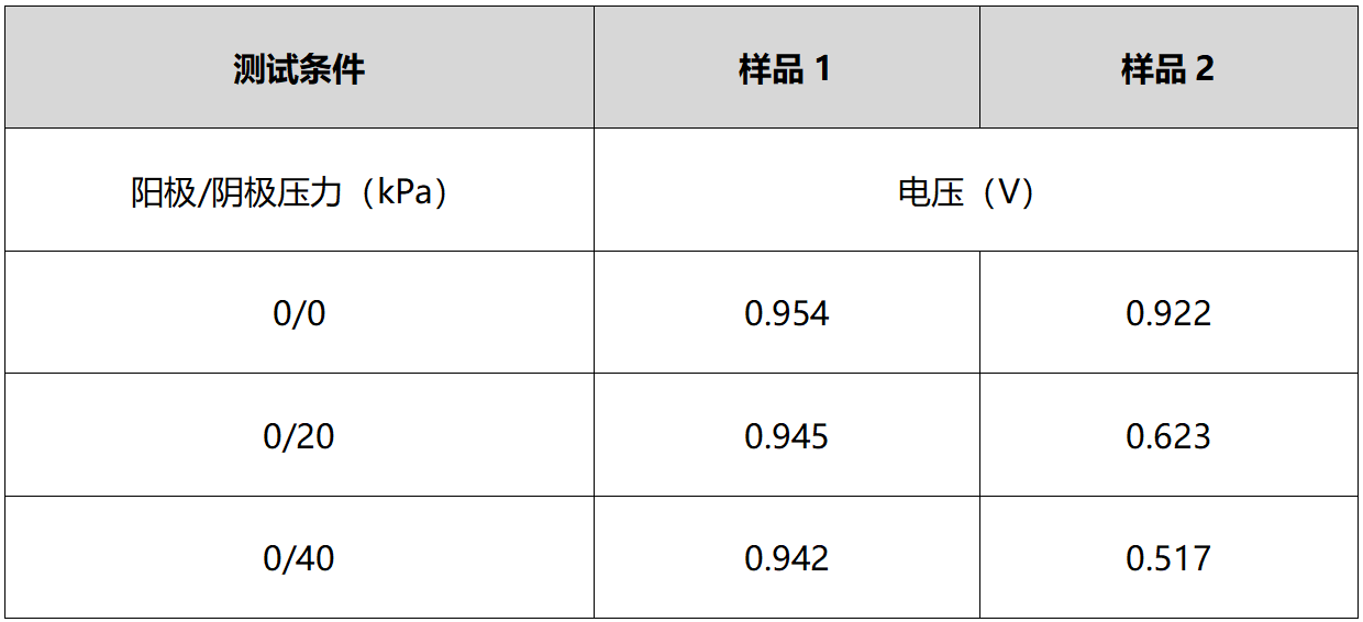 压差式开路电压变化的理论分析如下:测试样品的阳极催化剂为IrO₂,并添加Pt作为消氢剂,阴极催化剂为Pt。当阴极侧渗透的氢气进入阳极侧后,会与阳极侧的氧气发生反应,导致氧气或空气被消耗,使阳极侧的氧(或空气)分压降低,从而引起开路电压下降。该现象与燃料电池能斯特方程的预测结果一致,表明此测试体系在本质上可视为构建了一个类似燃料电池的反应环境。