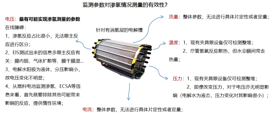 温度:现有夹具与设备仅能监测电解槽整体温度,无法定位至单片。即便采用定制化的温度分布监测夹具,也难以在完整电解槽中实现有效集成与测试。此外,电解槽运行过程中阳极通入过量水,氢氧反应所产生的热量会被迅速带走,因此难以通过温度变化在线诊断渗氢现象。